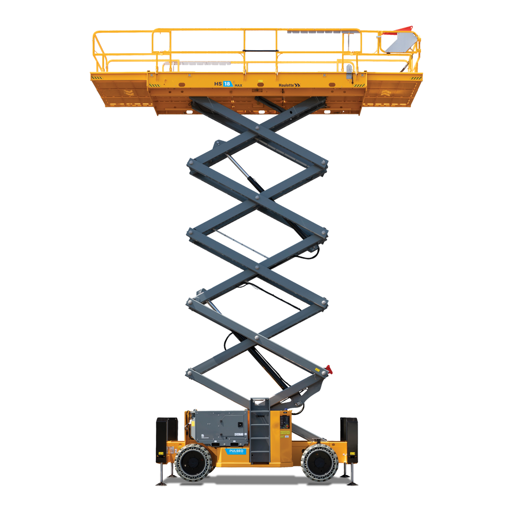 The HS18 E MAX scissor lift is equipped with a broad work platform with two extensions. The work area can reach up to 7.40 m long, allowing space for up to 4 workers while also leaving room for tooling and other supplies/equipment.