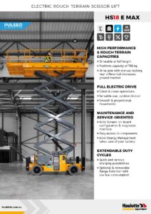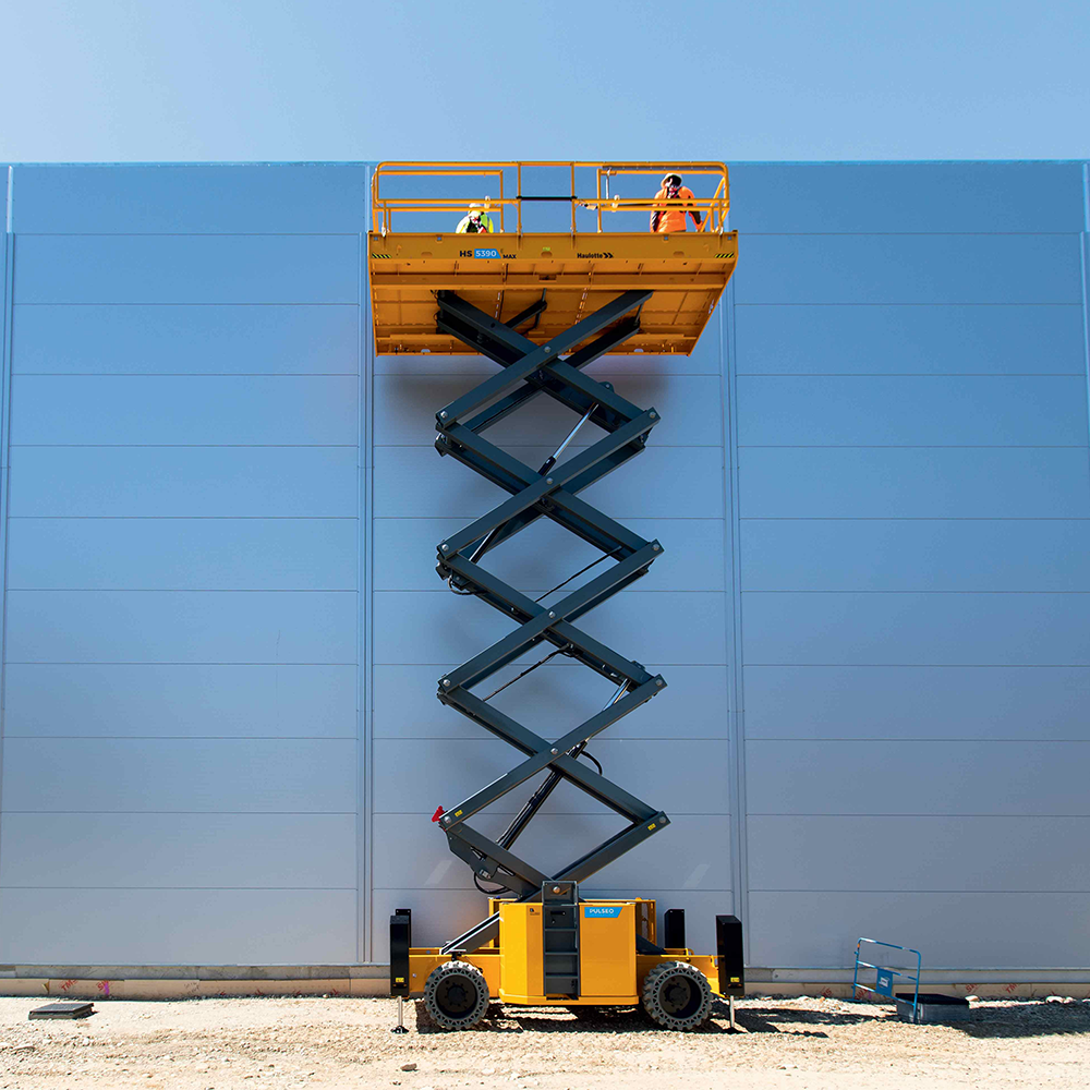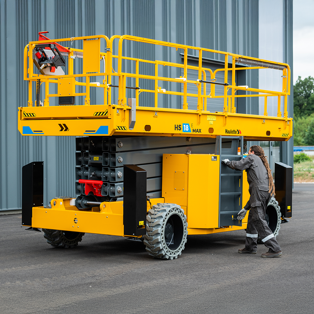 The HS18 E MAX scissor lift can climb slopes up to 45% and have a high ground clearance. It can move over highly uneven terrain and adapt to any situation.
