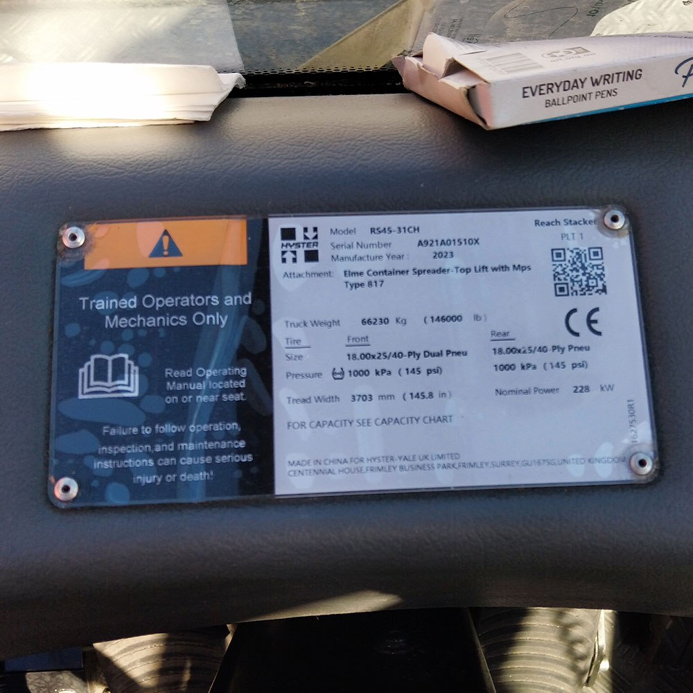 This 2023 Hyster Rs45-31CH Reach Stacker is a late-model, low-hour unit in good overall condition, offering an excellent opportunity for buyers seeking a quality machine. Inspections welcome.