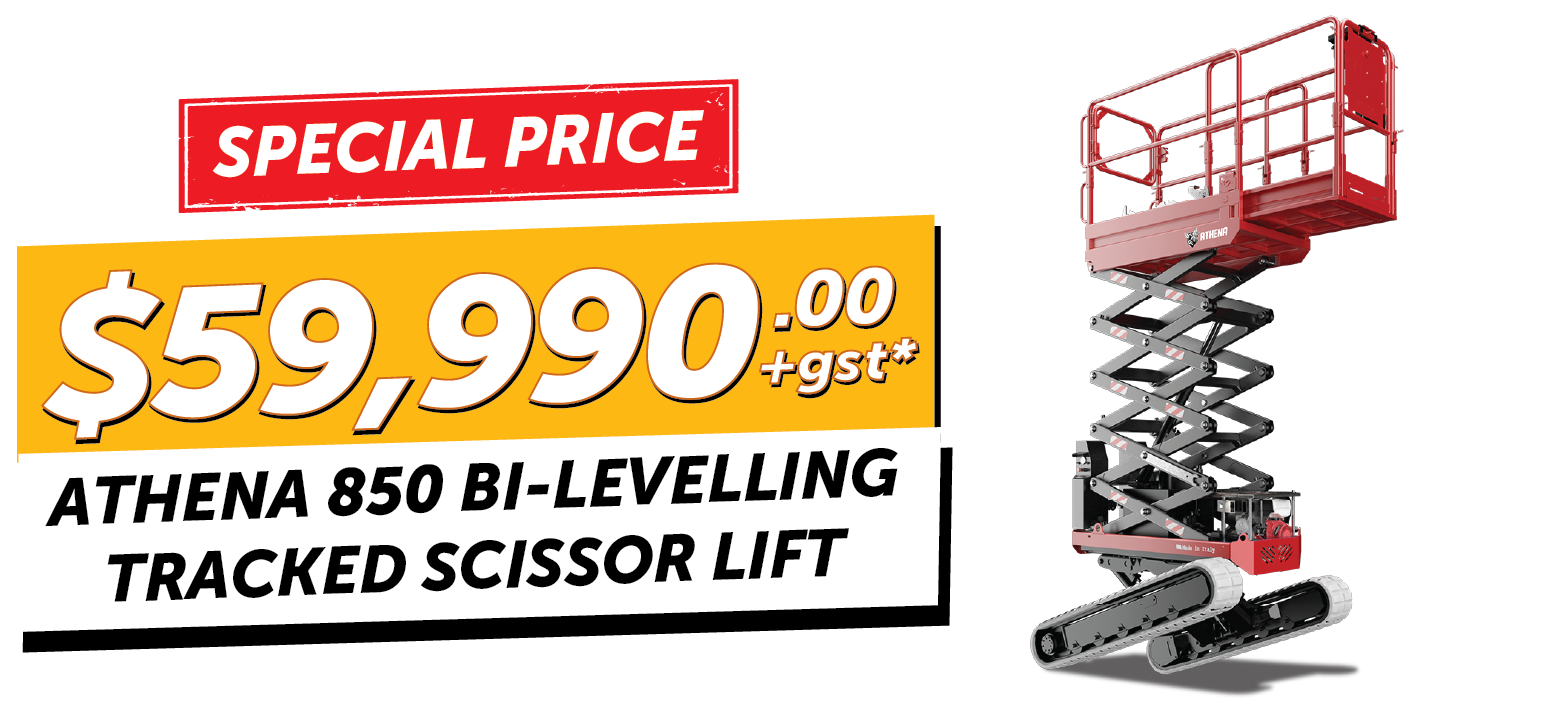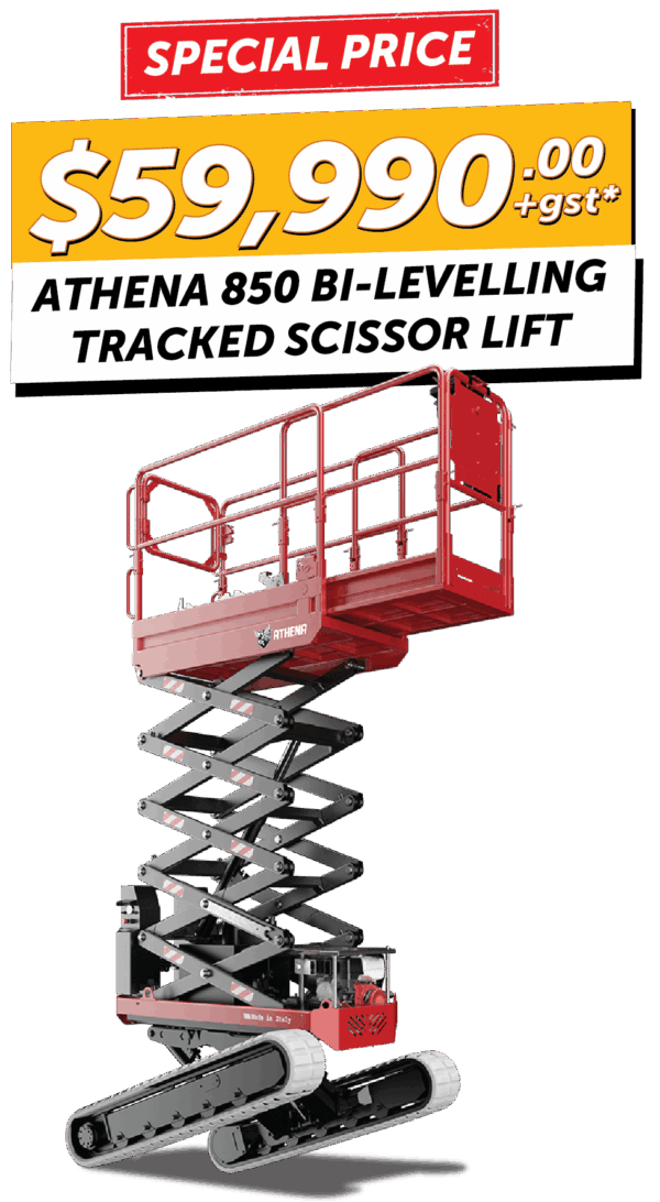 Designed for performance and flexibility, the Athena 850 Bi‑Levelling Scissor Lift delivers powerful lifting capability in a compact, all-terrain package—perfect for both indoor and outdoor applications.
